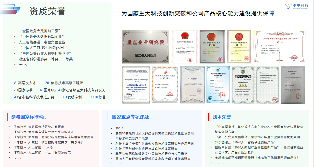 作為國內政務、政法數智領軍企業,中奧科技深耕數智大腦15年,專注于以產品與方案組合方式服務公安領域 10+ 年,通過業務+數據+智能融合方式引領行業數智發展,構建生態合作體系,堅持自主創新,擁有 30 +軟件發明專利、110 +軟著、 創建10 +產學研聯合實驗室,沉淀 100 +算法模型及AI應用,為杭州G20峰會、烏鎮互聯網大會、2022北京冬奧會等活動提供核心數智技術安保服務。